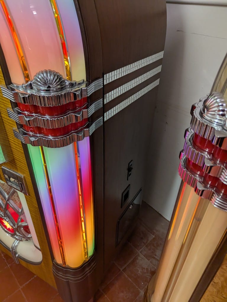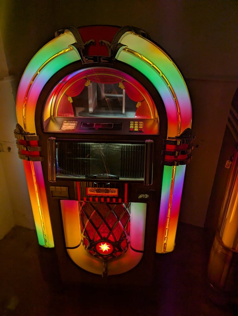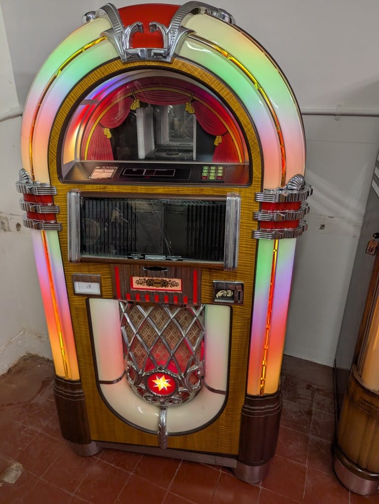 Nsm nostalgia gold lol bubbler cd jukebox,plays 100 CDs,we can also retro fit Bluetooth if required so you can connect any device ,phone,iPod ,tablet etc,loads of features Inc random continuos play, set on freeplay play,comes with remote,manual and heys,visible vertical mechanism ,on casters so easily moveable,rotating colour tubes in pallisters and arch,fantastic powerful sound!